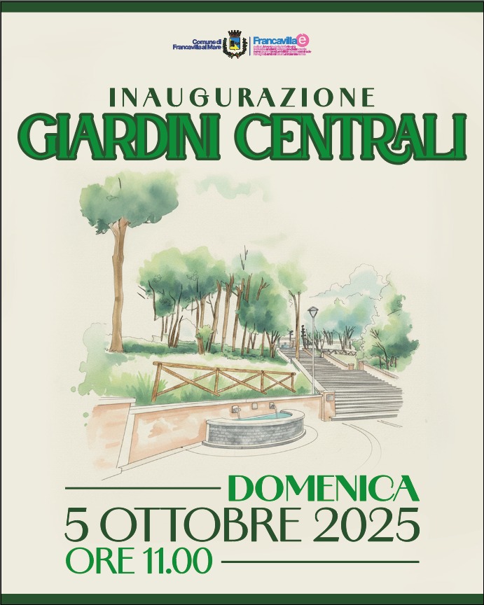 L'Amministrazione Comunale è lieta di invitare la cittadinanza, il giorno 5 Ottobre alle ore 11:00, all'inaugurazione dei Giardini Centrali in Via Adriatica nei pressi dell'Ufficio Postale Centrale.